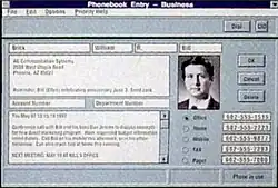 WindowPhone allows users of Microsoft Windows to view the caller ID of incoming calls on their telephone line. As shipped, it comprised a half-height 8-bit ISA expansion card, software on floppy disks, an AC adapter, and an RJ-11 telephone cord.[2] The user first connects a telephone cord from the wall to one of two jacks on the expansion card; then the user connects the expansion card to the user's receiver via the cord provided with the WindowPhone.[3] When a call is placed to the user's telephone line, the included software retrieves the caller ID information from the line and displays it atop the current Windows session via a pop-up window.[4] If the incoming call lacks caller ID, only the phone number is displayed.[5] By tapping a key after the call is picked up, this window expands to include more fields for the user to populate with e.g. the caller's name, relationship, and miscellaneous notes, saving this information to a database file that the software then consults and displays when the same incoming caller makes another call to the user. Besides textual information, the expanded window also provides a field for an image file representing the caller, as well as a map of their location.[6]