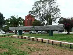 Central Park itself is home to "The Log," a massive log felled in the surrounding countryside which serves to remind the townsfolk of the timber (and dairy) driven history of the area, a de Havilland Vampire fighter plane (opposite the RSL Club), a cricket pitch (Phil Tufnell played an exhibition match in Wingham in which he was bowled for a duck in the first innings, by Glenn Levine, but made a good fist of it in the second), some children's play equipment, a drinking fountain commemorating the installation of mains water in the town, a small ornamental waterfall (which has been filled in with a garden), and two flag poles at opposite ends of the northern side of the park.