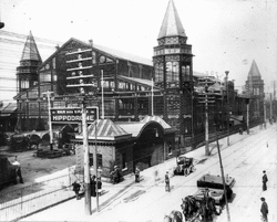 However, disaster struck the Exposition in 1901, when the complex was destroyed by a fire on St. Patrick's Day. The fire was caused by wind-blown embers from a nearby stable fire. The blaze engulfed the great Main Hall, leaving Machinery Hall the only surviving building on the six-acre site. Most of the Exposition was rebuilt at a cost of $600,000 and included new versions of Machinery Hall, the Main Hall and the Music Hall. The new Main Hall was constructed of steel, stone and massive brick walls. The Main Hall's heavy doors were adorned with cut white stone and the interior was decorated and illuminated by 1,500 incandescent lights under a vaulted and girdered ceiling.[2] However, by 1910, other cities that had been holding expositions dropped out of the field, but the Pittsburgh Exposition Society held on. Even while during the last decade, public interest in such affairs was declining, the society secured large attendance every year by increasing the facility's musical attractions by booking the greatest orchestras and bands of the country. The last exposition was held in the fall of 1916. On that occasion, the receipts fell off from the average of about $30,000, and the returns did not pay the expenses of the season. Over the next two years, hosting an exposition was deemed impossible, due to World War I and a polio epidemic.[1]