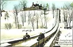 Recreational use of toboggans and sleds in coasting downhill is a traditional form of juvenile snow play.[24] Advancements in the 1880s include constructed snow slides as part of winter festival attractions (starting with Saratoga Springs), and the Flexible Flyer sled with steerable runners. Snow tubing and mountain coasters are more recent variants.