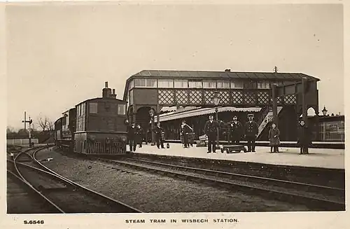 A new brick engine shed was also provided, with a 42 ft turntable, on a goods spur; initially it had only a single road to accommodate a trio of engines, but a second was added in 1893 to handle the station's growing traffic in perishables. This went out of use in the 1910s, with only the turntable remaining by 1925 when the London and North Eastern Railway had taken over responsibility for the line. Activities at Wisbech was by that time principally concerned with the tramway.[10] Tramway services departed from a specially-low platform at Wisbech.[11]