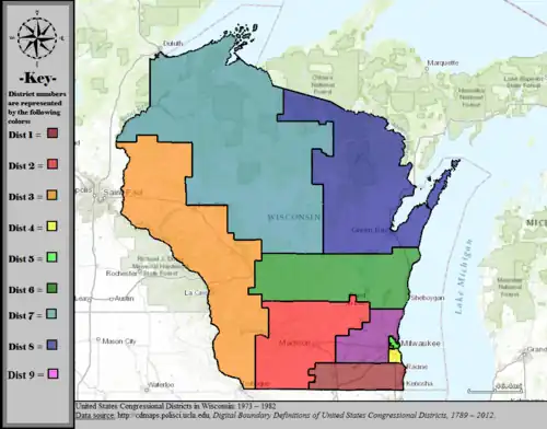 Table of United States congressional district boundary maps in the State of Wisconsin, presented chronologically.[6] All redistricting events that took place in Wisconsin between 1973 and 2013 are shown.