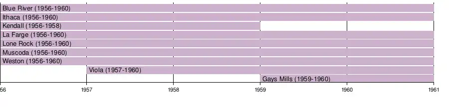 The Wisconsin River League sponsored eight-player football for the first time in 1956 with five conference members (Blue River, Ithaca, Lone Rock, Muscoda and Weston) participating, along with associate members Kendall of the Monroe-Vernon Conference and La Farge the Kickapoo Valley League.[13] Fellow KVL member Viola joined in 1957 to bring the football roster to eight schools.[14] After football member Kendall consolidated with Elroy of the Scenic Central Conference,[15] Gays Mills was brought over from the Kickapoo Valley League as their replacement for the 1959 season when they fielded their inaugural football squad.[16] The conference continued with six active full members until it ceased operations after the 1960 football season. Five of the displaced schools (Blue River, Ithaca, Lone Rock, Muscoda and Weston) joined with four members formerly of the Iowa County League (Barneveld, Highland, Hollandale and Ridgeway) to form the I-W League.[17] The sixth school (Avoca) was closed and its high school students were redistricted to Muscoda.[18]