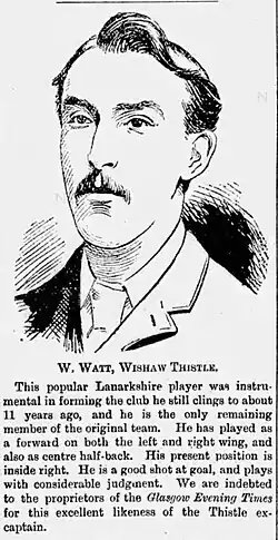 A new senior club - simply named Wishaw - was founded in June 1899, its foundation being the result of the Junior side Wishaw Victoria wishing to use the Wishaw Cycling Club's Belhaven Park pitch over the winter, and deciding to turn Senior.[26][27] Its formation was a mutually destructive move; the new club signed up a number of expensive players, but crowd sympathies lay with Thistle, who attracted the higher crowds.[28] In 1899–1900, Thistle hosted Wishaw in the Scottish Cup first qualifying round in "the tit-bit of the whole round"[29] and, before 2,000 spectators, the new club won 1–0; Thistle lost regular player Nelson on the eve of the match as he had signed for Reading. Thistle protested on the basis that Joseph Donaldson of Wishaw had played for Stevenston Thistle F.C. in the close season, so was not eligible for Wishaw, but the protest was dismissed, witnesses not coming up to proof and the chairman saying "a worse protest had never come before the Association".[30]