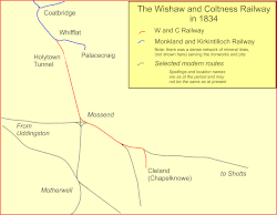 Priestley says that the line was "designed to pass from the collieries of Chapel and Crawfoot, in the parish of Cambusnethan, in the county of Lanark, through Daiziel, Hamilton, Bothwell, Coltness, Overtown, Wishawtown, Motherwell, Burnhouse and Carnbroe, to join the Monkland and Kirkintilloch Railway at Old Monkland; with a branch to Rosehall; a second to the collieries of Stevenson, Carfin and Cleland; and a third from these last places to Law, in the parish of Carluke, in the same county of Lanark".[6] Several of these objectives were never achieved in the independent lifetime of the company.