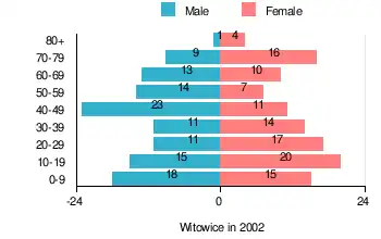According to the 2002 Poland census, there were 229 people residing in Witowice village, of whom 50.2% were male and 49.8% were female. In the village, the population was spread out, with 27.5% under the age of 18, 32.3% from 18 to 44, 19.2% from 45 to 64, and 21% who were 65 years of age or older.[1]