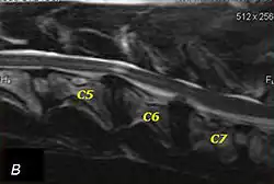 The disease tends to be gradually progressive. Symptoms such as weakness, ataxia, and dragging of the toes start in the rear legs. Dogs often have a crouching stance with a downward flexed neck. The disease progresses to the front legs, but the symptoms are less severe. Neck pain is sometimes seen. Symptoms are usually gradual in onset, but may progress rapidly following trauma.[6] X-rays may show misaligned vertebrae and narrow disk spaces, but it is not as effective as a myelogram, which reveals stenosis of the vertebral canal. Magnetic resonance imaging has been shown to be more effective at showing the location, nature, and severity of spinal cord compression than a myelogram.[7] Treatment is either medical to control the symptoms, usually with corticosteroids and cage rest, or surgical to correct the spinal cord compression. The prognosis is guarded in either case. Surgery may fully correct the problem, but it is technically difficult and relapses may occur. Types of surgery include ventral decompression of the spinal cord (ventral slot technique), dorsal decompression, and vertebral stabilization.[8] One study showed no significant advantage to any of the common spinal cord decompression procedures.[9] Another study showed that electroacupuncture may be a successful treatment for Wobbler disease.[10] A new surgical treatment using a proprietary medical device has been developed for dogs with disc-associated wobbler disease. It implants an artificial disc (cervical arthroplasty) in place of the affected disc space.[11]