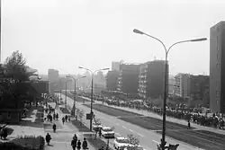 In 1959, Katowice authorities decided to redevelop the city center, including the Market Square. The northern row of tenements was demolished to widen Red Army Street and initiate the expansion of the city center to the north, which until then had been occupied by the former buildings of the "Marta" steelworks and the von Thiele-Winckler palace.[8][25] Plans for the street widening began as early as 1938, with the demolition of buildings at numbers 4 and 5.[18] During the 1960s, the so-called Block Zachód was constructed, a series of galleries and service-commercial buildings. The project also involved building high-rises: Separator (1968), Ślizgowiec (1968), and Superjednostka (1967–1972).[26] In 1965, a roundabout at the intersection of Feliks Dzierżyński Street (now Chorzowska Street) and Walenty Roździeński Avenue was built, featuring underground pedestrian passages designed by W. Lipowczan.[26]
