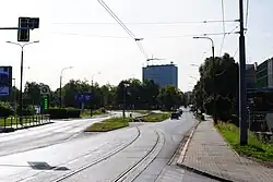 At the Jerzy Ziętek Square, the avenue intersects with Walenty Roździeński Avenue (forming part of National Roads 79 and 86, Expressway S86, and Drogowa Trasa Średnicowa) and Chorzowska Street (National Road 79, Drogowa Trasa Średnicowa).[5] The road then enters the Koszutka district,[1] flanked by the KTW high-rises, Spodek arena,[6] and the Central Mining Institute near Gwarków Square,[7] crossing Misjonarzy Oblatów MN and Katowicka streets.[1]