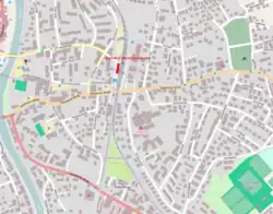 The station is located to the east of central Wolfratshausen. The station building is located to the west of the tracks and has the address of Bahnhofstraße 41.[5] Bahnhofstraße, Sauerlacher Straße and Straße Am Floßkanal run to the west of the tracks. In the south of the station building is the Wolfratshausen bus station. The southern part of the station precinct is crossed by state route 2070, running along Sauerlacher Straße and crossing the tracks over a level crossing. Mühlpointweg passes through a tunnel under the tracks to the north of the station.