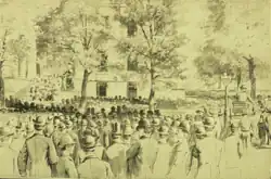 Many women in Cleveland, Ohio were inspired by a speech given by Diocletian Lewis to fight against the vices of alcohol.[3] Contemporary literature depicted alcohol abuse among men as a driver of domestic abusive, profligacy, and neglect of their duties to their families.[4] The goal of the crusade was to close as many saloons as possible using methods of prayer, song, and exhortation as customers walked in and out of the saloons.The women faced pushback by business owners who turned the tables on them by singing outside of the crusaders' homes and paying other women to mock them.[5] Ohio was the central location of the crusade, with over one-third of the events taking place there, but the crusade spread to over 900 different communities in over 31 states in the United States.[3]