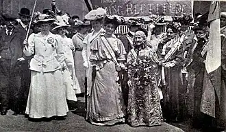 The event was organised by Emmeline Pethick-Lawrence, the WSPU's treasurer, and featured the WSPU colours (purple, white and green) for the first time in public.[4] Women were asked to wear white dresses, and leading up to the event, shops offered displays of clothing for attendees. The Daily Chronicle noted: "White frocks will be prominent in the windows with a plentiful supply of dress accessories in violet and green".[5] In the two days before the event, over 10,000 scarves in the colours were sold at two shillings and elevenpence each. Men wore ties in the colours.[6]