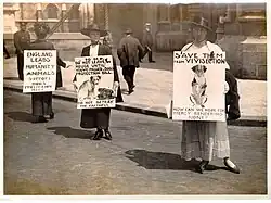 The British Animal Defence and Anti-Vivisection Society came to widespread attention during the Brown Dog affair (1903–1910), which began when Lizzy Lind af Hageby infiltrated the vivisection in University College London of a brown terrier dog. The subsequent description of the experiment in her book, The Shambles of Science (1903) — in which she wrote that the dog had been conscious throughout and in pain – led to a protracted scandal and a libel case, which the accused researcher won. The affair however continued for several years, making a name both for Lind af Hageby and for the society.[29] Australian writer and academic Coral Lansbury writes that the suffragist movement in the United Kingdom became closely linked with the anti-vivisection movement. Writing about the Brown Dog affair, she argues that the iconography of vivisection struck a chord with women. The vivisected dog muzzled and strapped to the operating board, she argues, was a symbolic reminder of the suffragette on hunger strike restrained and force-fed in Brixton Prison, as well as women strapped into the gynaecologist's chair by their male doctors, for childbirth, for sterilization, as a cure for "hysteria", and as objects of study by male medical students.[30]