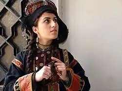 Because Georgian culture is a patriarchal one, women are accorded a chivalric form of respect.[8] Women can have the role of both as "breadwinner and housewife". Most of the chores at home are done by women. There is no "explicit division of labor" according to gender, except in so-called "areas of physical labor" (an example is in the field of mining). The statue of Mother of Georgia (Kartlis Deda, or "Mother of Kartli") that stands at a monument in the hills above Tbilisi perhaps best symbolizes such national character: in her left hand she holds a bowl of wine with which she greets her friends and in her right is a sword drawn against her enemies. One of the most important and powerful rulers of Georgia was Queen (king of kings) Tamar the Great. In more recent history Georgian women have been able to acquire various positions in the military including being among the few professional fighter and helicopter pilots of the country's small air force and also a small number in the army's special operations forces.[9] Many women also serve in the field of law enforcement and the government. However, no women are allowed to become priests of the Orthodox church.[8] The so-called "traditional stereotypes of gender-defined social roles" are undergoing changes because of the education being received by new generation of women.[8] Clothing norms stipulate that inside churches, head covering and dress or skirt for women are usually required.