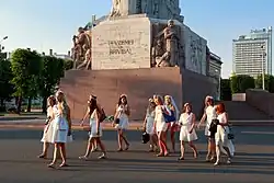 Before the 19th century, women were excluded from the political processes, did not have property rights and were expected to run the household.[6] Latvian women were granted the rights to vote after the proclamation of Latvian Independence in 1918.[7] The past decades have seen the gradual transformation of the status and role of women, as Latvia has regained its independence from the Soviet Union and joined intergovernmental organisations, such as the European Union, promoting equality of both genders.[8] Latvia was the first country amongst the former Eastern bloc countries to have a female head of state, former president Vaira Vīķe Freiberga.[9] Latvia has also had two female Prime Ministers since independence, Laimdota Straujuma[8] and the incumbent Evika Siliņa,[10] who has been serving since September 2023. The European Gender Equality Index indicates that Latvia still ranks below the European Union average on gender equality issues, placing 18th out of the 28 member states.[11] Although women make up more than a half of Latvia's current population, women are still underrepresented in politics,[12] experience lower wages in comparison to their male counterparts and are still expected to take up the traditional gender role.[13] Accordingly, a relatively recent development has been the struggle of women to find a work–life balance.[14] The notion of gender equality is fairly new in Latvia.[15] In the past decade, synchronously with feminism movements around the world, Latvia has seen its own women's movement gradually emerging once again.[16][17]