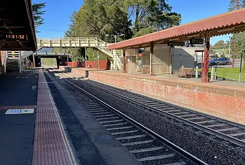 The station once had extra sidings on the far side of Platform 2, as well as a turntable. The sidings were abolished in February 1990,[2][3] and the turntable was relocated to Castlemaine in the early 1990s, for use by the Victorian Goldfields Railway.