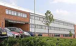 The original building, completed in 1962, was partially destroyed in a large fire in 1975.[4] It caused many pupils to be transferred to other schools while the building was demolished and replaced with a newer building. Some pupils were housed in a temporary structure made out of portable units that was reinforced by a brick built super structure at the back of the school grounds - this was built to be a temporary home for the upper school while the new main building was built and was intended to be pulled down once the new part of the school opened, with a maximum life of around 3 years. It was finally demolished in 2005 as part of the extension work, 30 years after it was first built. On the site of this building, called the Westfield Building, is a new large car park.[4]