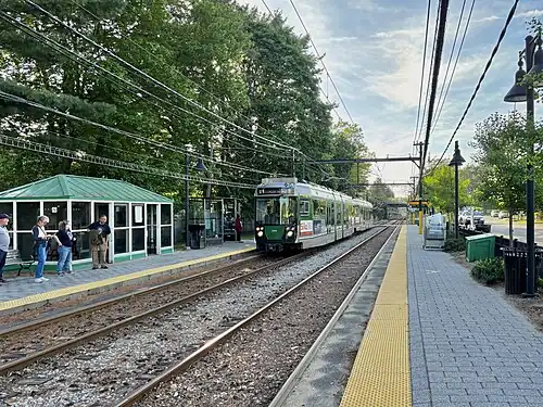 In June 1957, the Massachusetts Legislature approved the purchase of the branch by the M.T.A. from the nearly-bankrupt New York Central Railroad for conversion to a streetcar line. Service ended on May 31, 1958.[3] The line was quickly converted for trolley service, with bare platforms and small shelters at each station. The new Woodland station was built somewhat to the east of the original station, as the latter was surrounded by a golf course with no room for a parking lot. Because of this, the station building was not torn down like most on the line were. The branch reopened with trolley service on July 4, 1959.[2] The M.T.A. was folded into the Massachusetts Bay Transportation Authority (MBTA) in August 1964.[2]