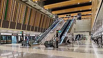The TEL platforms are accessible via many escalators and stairs, with a large visual opening.[48] The linkway that connects the TEL platforms to the NSL platforms have gaps in the roof to allow sunlight into the station.[24] Largely naturally ventilated, the station utilises minimal energy. The four entrances of the TEL station are also naturally ventilated, with transparent structures to allow sunlight into the entrances. They are intended to function as "lanterns" that will light up the urban landscape around the entrances at night.[48][49] The station design won the LTEA 2022 under the Infrastructure and Development category.[50]