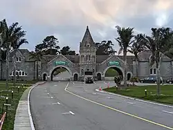The Masonic Grand Lodge of California laid the cornerstone for the cemetery during a ceremony held on October 29, 1904, at a 47-acre (19 ha) site formerly used as the Seven Mile House on the stagecoach route linking San Francisco and San Jose.[2]: 117 The entrance to the cemetery is marked by two prominent arches; T. Paterson Ross was responsible for designing the original entry arch, which was built with blue granite blocks quarried from Raymond, California. A second arch was added in the 1930s alongside administrative offices, a columbarium, mausoleum, and chapel, designed by William G. Merchant and Bernard Maybeck.[2]: 118