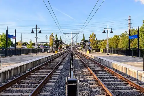 The station officially opened for service on Saturday, November 24, 2007, and as part of its opening celebration fares were not collected.[7] Regular service with fare collection began on Monday, November 26, 2007.[7] By 2017, the side platforms were lengthened to allow three-car trains at the station.[8]
