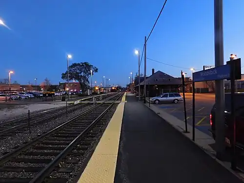 Woodstock is a commuter railroad station on Metra's Union Pacific Northwest Line located in Woodstock, Illinois. The station is located on the Harvard branch of the Northwest Line and is the last stop before Harvard; inbound trains run as far as Ogilvie Transportation Center in Chicago. The station is located in fare zone 4. Woodstock is 51.6 miles (83.0 km) from Chicago via Metra.[2] The station consists of two grade-level side platforms which serve two tracks; there is a rail crossover located just north of the station. As of 2018, Woodstock is the 149th busiest of the 236 non-downtown stations on the Metra system, with an average of 273 weekday boardings.[1]