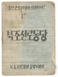 The Workers' Party of North Korea (Korean: 북조선로동당; Hancha: 北朝鮮勞動黨) was a communist party in North Korea from 1946 to 1949 and was a predecessor of the current Workers' Party of Korea. It was founded at a congress on 28–30 August 1946, by the merger of the northern branch of the Communist Party of Korea and the New People's Party of Korea.[1][2][3] Kim Tu-bong, the leader of the New People's Party, was elected chairman of the party, while Chu Yong-ha and Kim Il Sung were elected as vice chairmen.[4] At the time of establishment, the party is believed to have had about 366,000 members organized in around 12,000 party cells.[4][5]
