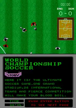World Championship Soccer (ワールドカップサッカー) is a soccer game running on Sega's Mega-Tech[1] arcade cabinet system and was released as one of the first games for the Sega Genesis system in North America in September 1989.[2]