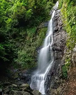 The Wufengqi Waterfalls (Chinese: 五峰旗瀑布; pinyin: Wǔfēngqí Pùbù) are a popular tourist attraction located in the Wufengqi Scenic Area in Jiaoxi Township, Yilan County, Taiwan. They are so named because they stand in front of a row of five steep mountains, whose sharp peaks resemble the five triangular flags (三角旗) hanging down the back of war generals in Chinese opera.