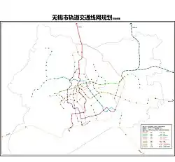 According to the long-term planning of Wuxi Metro, it will form a network of 8 lines and 1 branch line, S1、S2 and the network would be 350 km (220 mi) long in long-term planning.[12]