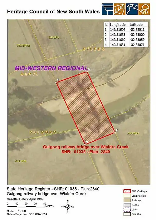 - ^ a b "Gulgong railway bridge over Wialdra Creek". New South Wales State Heritage Register. Department of Planning & Environment. H01038. Retrieved 2 June 2018.