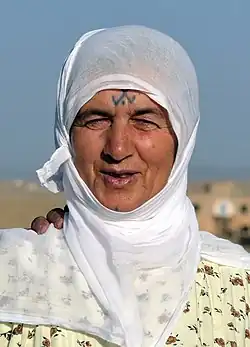 Deq (دەق) or xał (خاڵ) are the traditional tattoos of Kurds. Deq is more commonly found among Kurdish women, but is also observed among men. However, the practice of deq has become less common due to the influence of Islam and has been substituted with henna. Unlike the henna, deq is not temporary. Efforts have been made to revitalize the usage of deq as a way of reasserting one's Kurdish identity.[1] Deq is also practiced by Yazidi Kurds.[1]