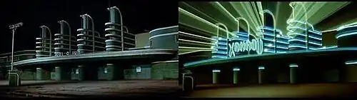 Kenny Ortega and Jerry Trent served as choreographers. The Pan-Pacific Auditorium in Los Angeles was used for exterior shots of the nightclub. Sonny refers to the venue as "a dump" and the real Pan-Pacific Auditorium had fallen into disrepair. Danny remarks that "they used to have wrestling here," which was indeed true of the Pan-Pacific. The building was destroyed by fire a decade later. Xanadu's nightclub interior was built on Stage 4 of the Hollywood Center Studios beginning in 1979.[6] Olivia Newton-John recalled problems with the script and the many story changes that occurred during filming.[7]
