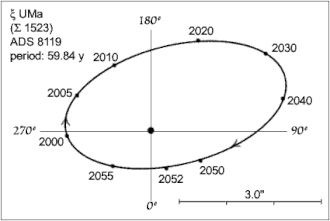 Xi Ursae Majoris was found to be a visual double star by William Herschel in 1780,[13] and in 1804 he presented it as a likely physical binary star based on observed orbital motion.[14]: 363 It then became the first visual double star for which an orbit was calculated, when it was computed by Félix Savary in 1828.[13]