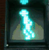 - Walking animation: The blue/green walking signal is usually constructed by seven differently shaped and positioned icons, and the walking or running movements are a result of persistence of vision. The Little Green Man moves in two or three different velocities: slow, fast, and occasionally, extremely fast. When the sign turns green, the little green man would first move slowly. After a certain duration of time (usually 14 seconds left on the countdown display, depending on width of pedestrian crossing), the animation would occasionally start moving at a faster speed or just simply flicker. When there is only ten seconds left to cross the street, the animation would occasionally move at its fastest speed and/or flicker.