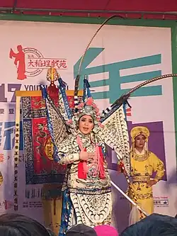 Beardless warriors who only "fight" on stage are considered wusheng rather than xiaosheng. However, the young warrior who sings is known as the wuxiaosheng (武小生; "martial xiaosheng"). A wuxiaosheng with some stature[4] wears a cap with two long pheasant tail feathers attached and is known as the zhiweisheng (雉尾生) or lingzisheng (翎子生; "pheasant-tail sheng"); this is usually a young general or a general's young son.[1] A zhiweisheng actor must be skilled at handling the feathers with their hands to express emotions.[5]