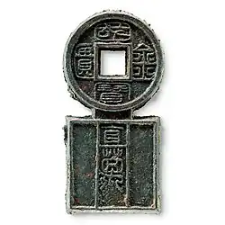 The Guobao Jinkui Zhiwan (traditional Chinese: 國寶金匱直萬; simplified Chinese: 国宝金匮直万; pinyin: guó bǎo jīn kuì zhí wàn, "National treasure gold deficiency, value ten thousand") is a piece of coinage usually attributed to Wang Mang, it's a piece of currency that resembles neither a traditional Chinese cash coin nor any other type of ancient Chinese currency shape such as a spade or knife.[4] The Guobao Jinkui Zhiwan coinage has a round top portion and a square lower portion.[4] The inscription "Guobao Jinkuo" surrounding the square hole located at the top portion is written in a rather unusual order going first top, then left, then right, and then bottom.[4]