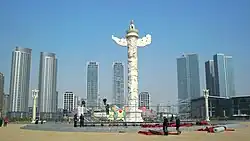A huabiao was once located at the center of the square.[5] It was first built in 1997 to commemorate the handover of Hong Kong. It was the tallest huabiao in China, and became one of the landmarks and symbols of Dalian. It stood at a height of 19.97 meters, and had a diameter of 1.997 metres. It was demolished secretly on August 5, 2016, at midnight, which was believed to be out of political reasons related to the downfall of Chinese politician Bo Xilai, who oversaw the construction of Xinghai Square and the central huabiao during his tenure as the mayor of Dalian. Local media remained in silence about this, and reports by mainland media were soon deleted.[6]
