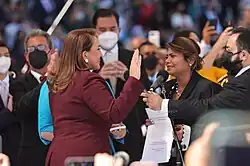 Castro was inaugurated as president on 27 January 2022.[39] She was sworn in at the Tegucigalpa National Soccer Stadium,[40] with thousands of individuals present. Among the attendees were King of Spain Felipe VI, Vice President of Taiwan Lai Ching-te, U.S. Vice President Kamala Harris, Vice President of Argentina Cristina Fernández de Kirchner, Vice President of Cuba Salvador Valdés Mesa and President of Costa Rica Carlos Alvarado Quesada.[41]