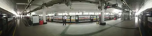 Xunfenggang Station (simplified Chinese: 浔峰岗站; traditional Chinese: 潯峰崗站) is an interchange station between Line 6 and Line 12 of the Guangzhou Metro, and serves as the western terminus for both lines.[1] The Line 6 station started operations on 28 December 2013.[2] It is located at the south of the area of Xunfenggang (浔峰岗), A1 Road, Jinshazhou, Baiyun District.[3] The terminus approaches near Lishui, Nanhai District, Foshan, which is just over the hill next to the station.[4] Line 12 opened at this station on 29 June 2025, thus becoming an interchange station.