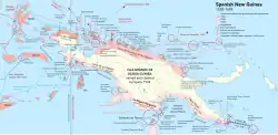 After the unsuccessful attempt of Bernardo de la Torre in 1543 to return to Mexico along a northern route, López de Villalobos commissioned Ortiz de Retes for the same mission but going south. On 16 May 1545, Ortiz de Retes, in command of the San Juan de Letrán, left port in Tidore, an island which was Spain's stronghold in the Maluku Islands and going by way of the Talaud Islands and the Schoutens, reached the northern coast of New Guinea, which was coasted till the end of August when, having got to the 5° S. latitude, contrary winds and currents forced a return to Tidore where he arrived on 5 October 1545. Many islands were encountered and first charted, along the northern coast of New Guinea, and in the Padaidos, Le Maires, Ninigos, Kaniets and Hermits, to some of which Spanish names were given.[2][3][4]