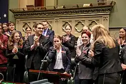 In 2013, the Parliamentary and Legal Reform Committee Debated the Marriage Equality Bill 2013.[14][15] This passed unanimously with 72 ayes to 0 noes.[16][17] Following the passing of the Bill, the chamber began to sing 'Advance Australia Fair'. This is a first for the YMCA NSW Youth Parliament. The Bill also passed in the Legislative Council with 40 ayes to 4 noes.[17]