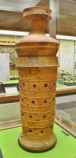 The mound was found to contain a total of 11 burials, including seven with wooden coffins, two with box-shaped stone coffins, and an earthen pit burial. The central burial is believed to be one of the wooden coffin burials near the north side of the mound, and jasper tubular beads and small glass beads have been found.[2] A large number of red-lacquered vessel stands and Yayoi pottery have been excavated from the eastern part of the mound and the surrounding moat. These artifacts have been collectively designated a National Important Cultural Property and are stored in the Hiroshima Prefectural Museum of History and Folklore.[3] From these artifacts, Yadani Tumulus is believed to have been constructed from the end of the Yayoi period to the beginning of the Kofun period.