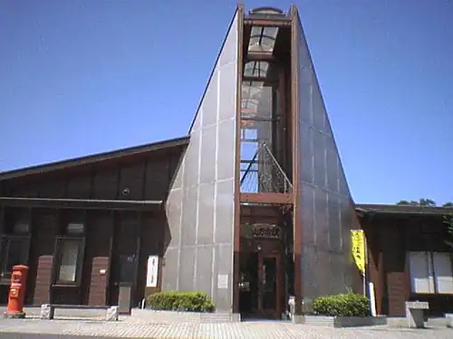The station consists of two opposed side platforms connected to the station building by a footbridge. The station also serves as the local community center and public library, and is staffed.