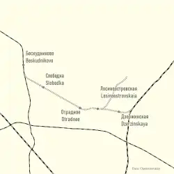 In 1900, a railway line connecting Beskudnikovo and Losinoostrovskaya was constructed. This was done in order to facilitate the railway traffic between Moscow and Kimry (Savyolovo), since Moscow Savyolovsky railway station was not open yet.[4] After a tram line from central line to Medvedkovo was built, in 1966 a direct connection to Losinoostrovskaya was discontinued, and the whole railway line was demolished in 1987.[4]