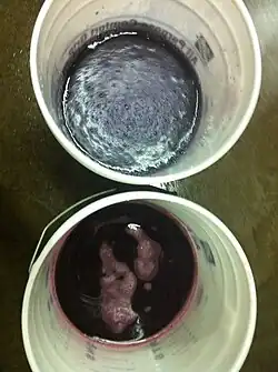 Two buckets of red wine must with the top bucket showing the bluish color change after diammonium phosphate (an ammonia base) is added to the wine.