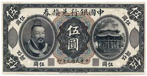 Bottom image: A 100-yuan banknote displaying the Yellow Emperor, issued in 1938 by the Federal Reserve Bank of China of the Provisional Government of the Republic of China (1937–40), a Japanese puppet regime in North China