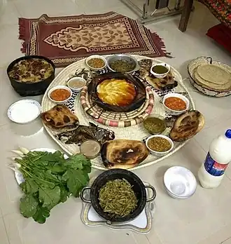 Breads are an integral part of Yemeni cuisine, most of which are prepared from local grains.[1] Unleavened flatbreads are common.[2] Ṣalūf, a flatbread made from wheat flour, is the most common of all breadstuffs. The dough is allowed to ferment with ḫamīra (yeast) , while some would baste the surface of the dough with a prepared batch of unseasoned fenugreek (ḥilba) prior to baking.[5] These were almost always baked at home in an earthenware oven called tannour (تنور) in Arabic, the size of each bread roughly being 2 cm (0.79 in) in thickness with a diameter of 20 cm (7.9 in) to 30 cm (12 in).[6]