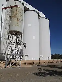 Chute for loading bulk grain into trains at Wunkar (the only station on the line to have bulk storage and loading facilities) in 2015 | ||||||||||||||||||||||||||||||||||||||||||||||||||||||||||||||||||||||||||||||||||||
