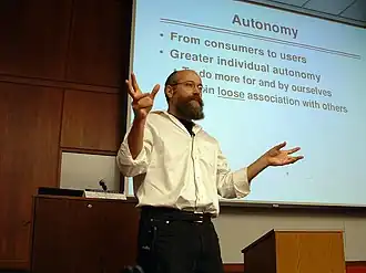 Benkler's 2006 book The Wealth of Networks[7] examines the ways in which information technology permits extensive forms of collaboration that have potentially transformative consequences for economy and society. Wikipedia, Creative Commons, Open Source Software and the blogosphere are among the examples that Benkler draws upon.[8] (The Wealth of Networks is itself published under a Creative Commons license.) For example, Benkler argues that blogs and other modes of participatory communication can lead to "a more critical and self-reflective culture", where citizens are empowered by the ability to publicize their own opinions on a range of issues, which enables them to move from passive recipients of "received wisdom" to active participants. Much of The Wealth of Networks is presented in economic terms, and Benkler raises the possibility that a culture in which information is shared freely could prove more economically efficient than one in which innovation is encumbered by patent or copyright law, since the marginal cost of re-producing most information is effectively nothing.